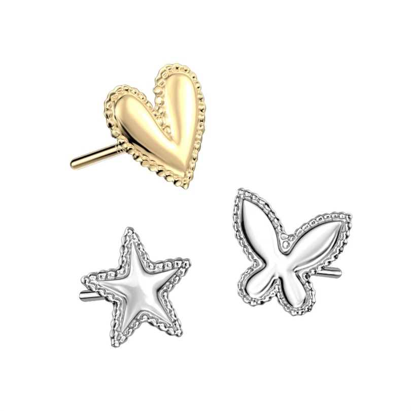 If you have a labret or barbell that can be paired with threadless tops, here you have the opportunity to buy an exquisite 14K gold design. And if you want style options, here you get all the options you could wish for! You can choose either 14K gold or 14K white gold material, but you also can pick the design from three cute options: heart, butterfly, or star. They all have a unique beaded edge, which gives them a distinct look. Which one do you go for?