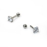 The bar has a length of 1/4" (6 mm), and the end ball at the back is 1/8" (3 mm). The barbell features a clear shiny stone in the front, available in two sizes: 1/8" (3 mm) or 5/32" (4 mm). The stone is held securely in place by four tiny prongs.