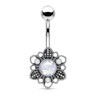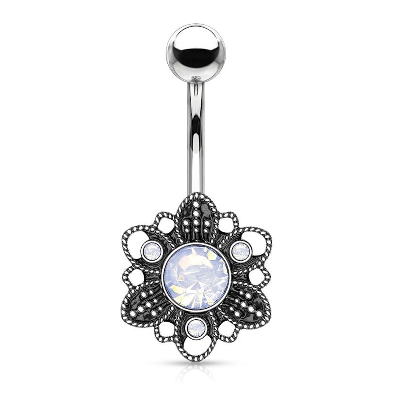 This belly ring is made in surgical steel, and the flower at the bottom is crafted from brass. The flower is coated in antique silver, which provides an oxidized and dark color. Around the flower, there is a thin braided edge and details that give depth to the piece.