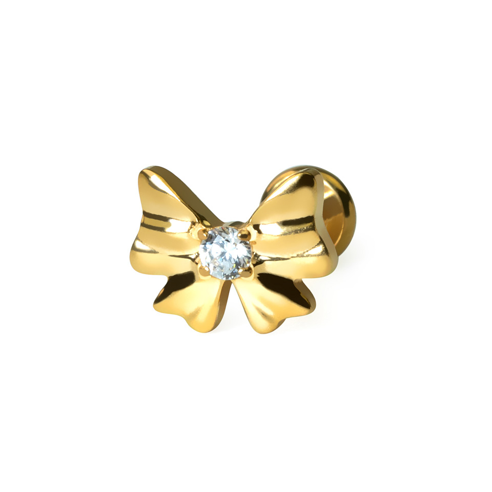 This sweet labret features a cute bow with a central delicate CZ stone. The bow spans 8 mm at its widest point, while the stone measures 2 mm in diameter.