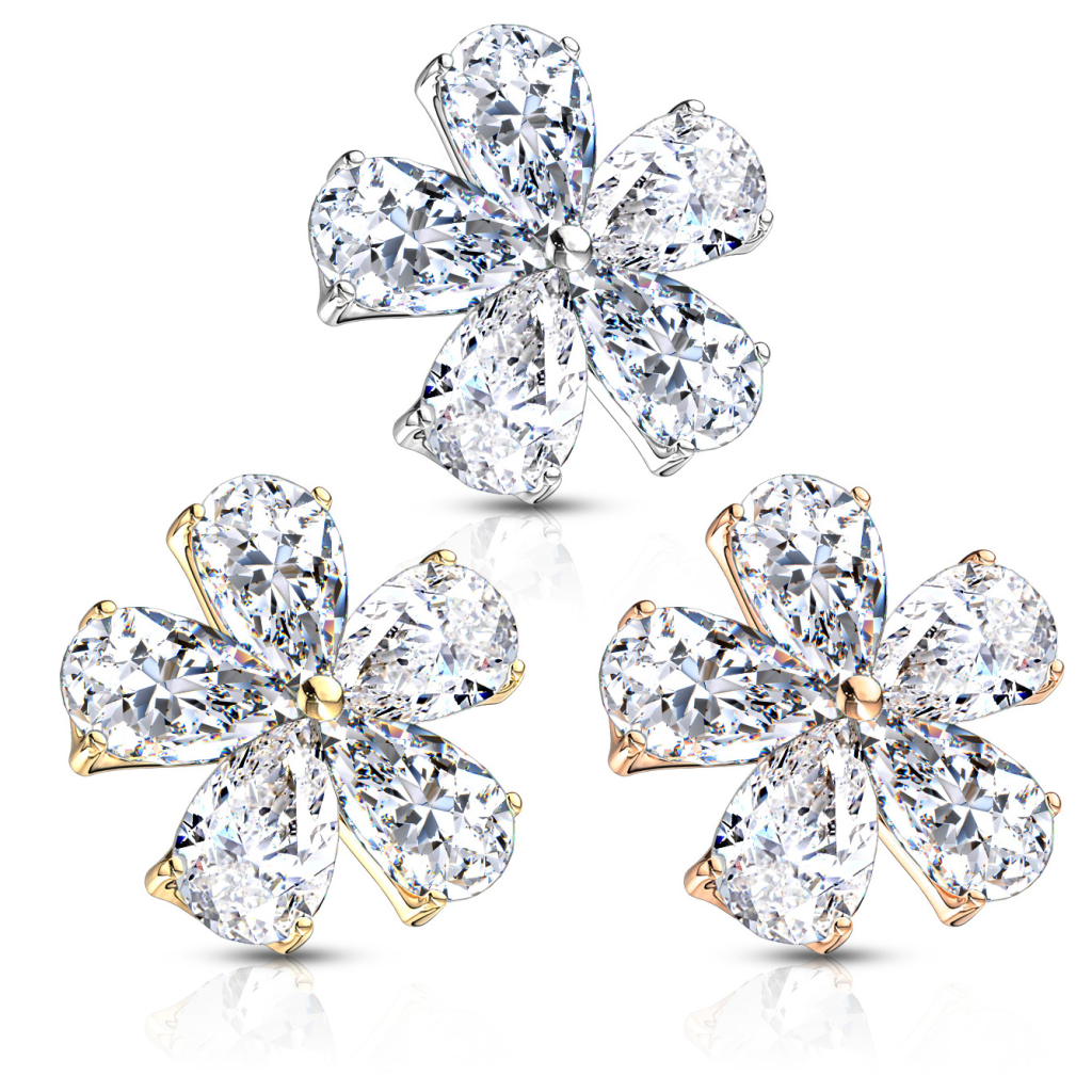 The item you've clicked on is a dermal top that represents a flower and to which five drop-shaped stones have been embedded to form its petals. It's crafted from brass and then coated to give it a beautiful color. You can choose from a variety of colors, including, for example, white gold and rose gold.