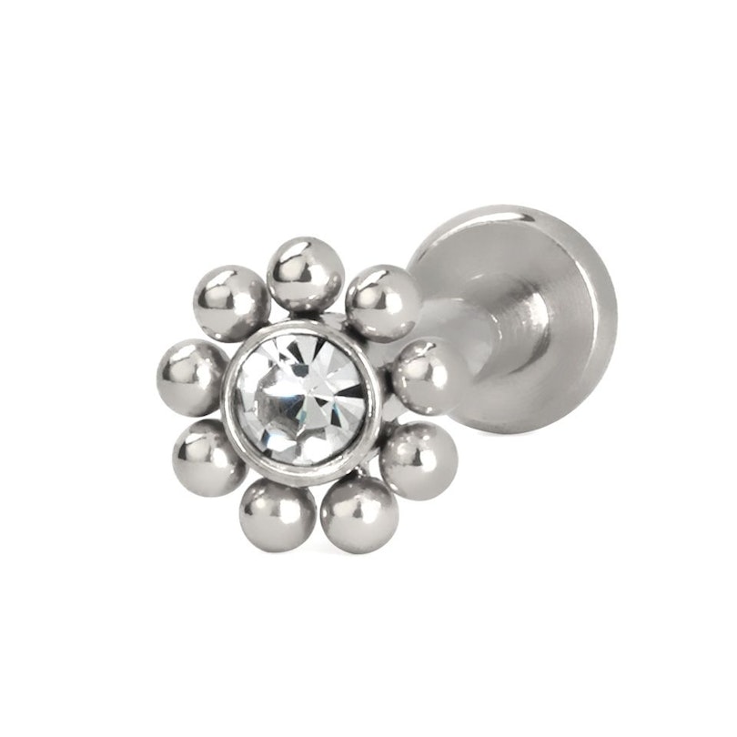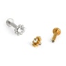 Also common is the clear stone in the front and the internal thread, which is screwed into the bar. The fact that they are internally threaded is an advantage over an external thread, where the thread can scrape or tear the inside of your piercing hole - an internal thread will prevent this.