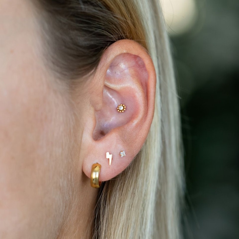 Placement: Tragus, Spiderbite, Snakebite, Medusa, Madonna, Lower labret, Lobe, Helix, Conch, Forward helix, Angelbite
