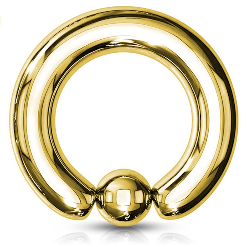 This is a fabulous ring made of solid surgical steel and gold-plated. Since a captive bead ring has a strong closure, we recommend that you use a ring opener to put this ring in your piercing. All the models have a diameter of around 1/2" (13 mm), but you can choose from different gauge sizes.