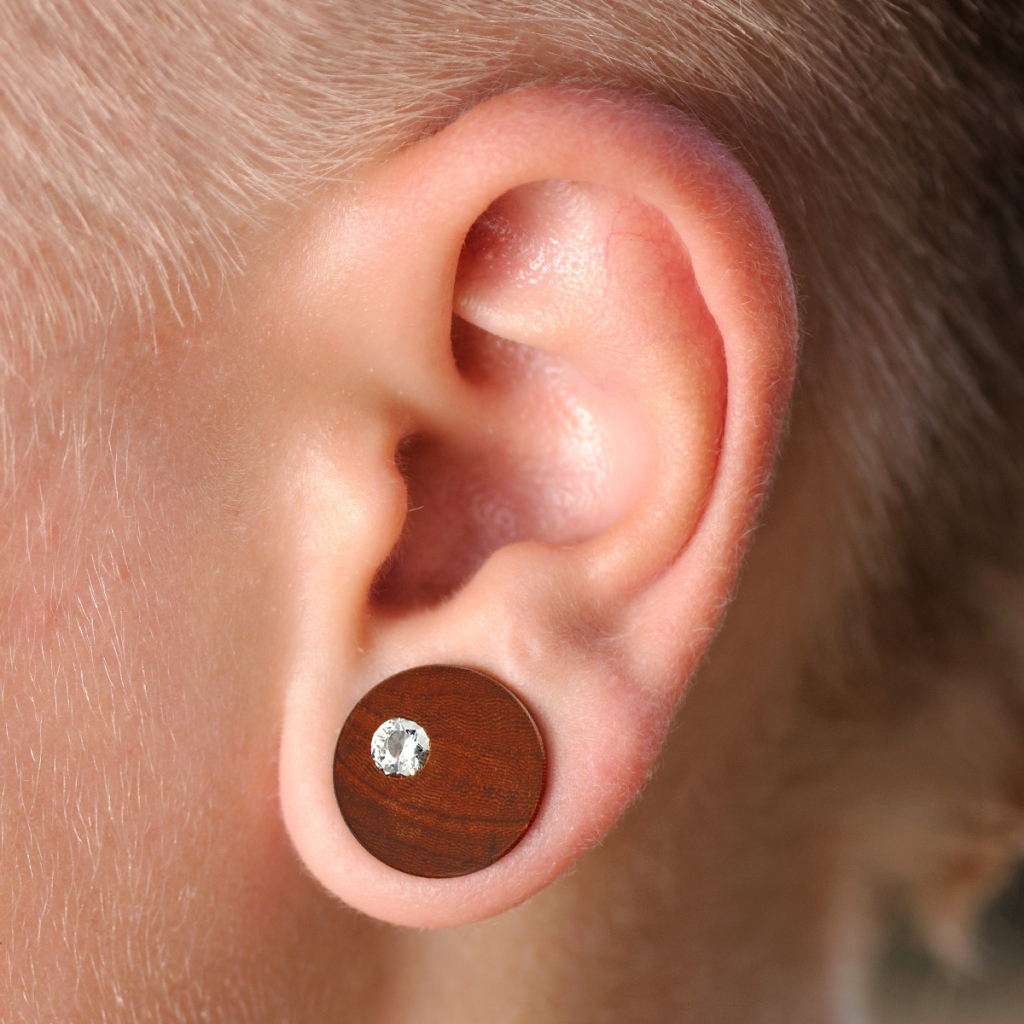 This plug is available in six different sizes and polished to get a flat surface and rounded edges. It's flat on both sides and features a beautiful white stone on the front. The stone is inlaid, so the surface is completely flat. The stone has a diamond cut and shines from every angle when light reaches it. It's a saddle plug, which allows the correct fitment in the gauge.