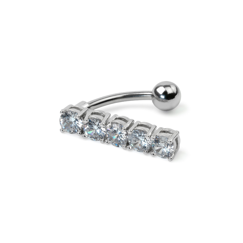 The belly button ring you see in the picture is a reverse belly ring, which means that, unlike regular belly rings, this one hangs from the top ball.