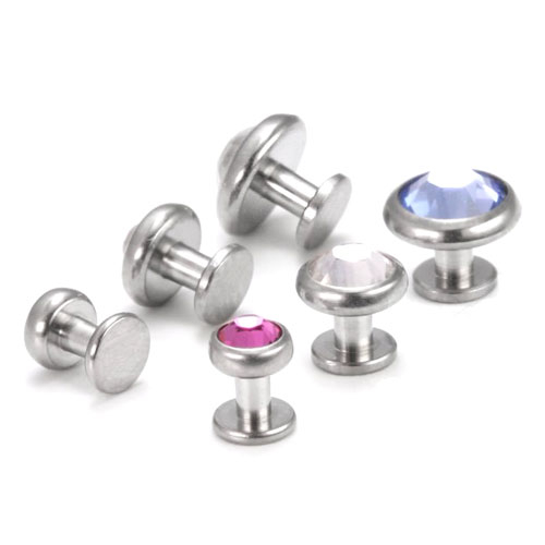 This skin anchor has a diameter of 1/8" (3 mm), both on the top and the bottom plates. The distance between them is 1/16" (2 mm), and the gauge size is 16g (1.2 mm). You can choose the gem color you prefer.