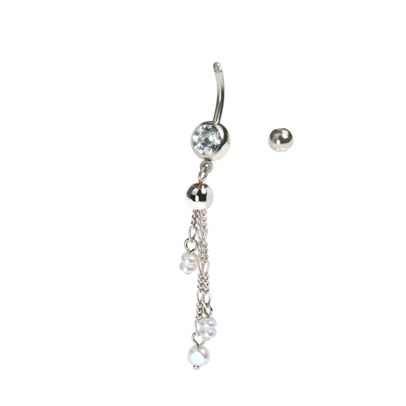 This belly barbell with chains and pearls features bezel-set cubic zirconia stones in both balls, and dangling from the lower ball are delicate chains with different-sized synthetic pearls.