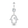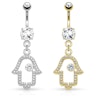 Belly button ring made of 14k gold with studded hamsa hand dangle