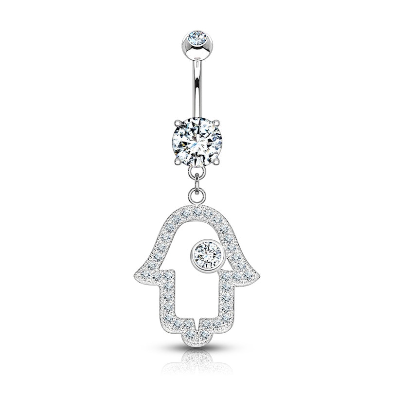 Name: Belly button ring made of 14k gold with studded hamsa hand dangle