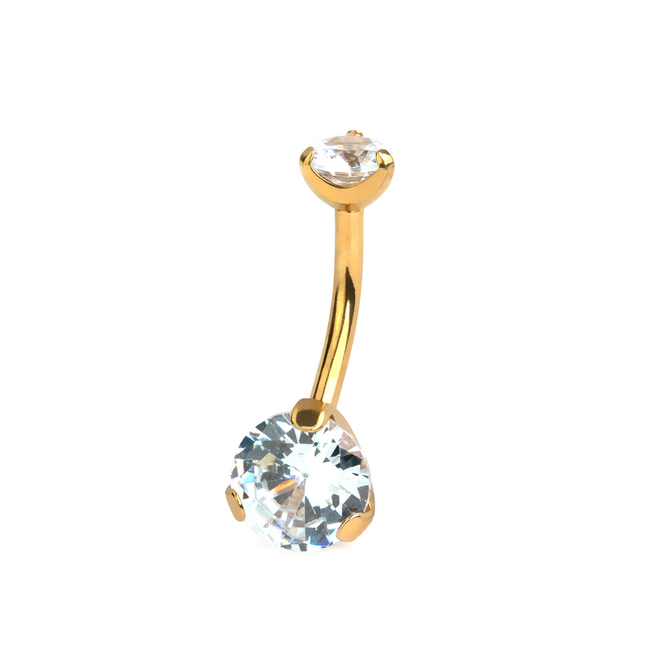 If you love belly rings with large gems, you're in the right place. In the picture above, you can see a belly button ring made of surgical steel, covered with different color layers. Both the top and the bottom balls have a beautiful zirconia stone, cut from different angles, which guarantees that light will reflect and shine like no other.
