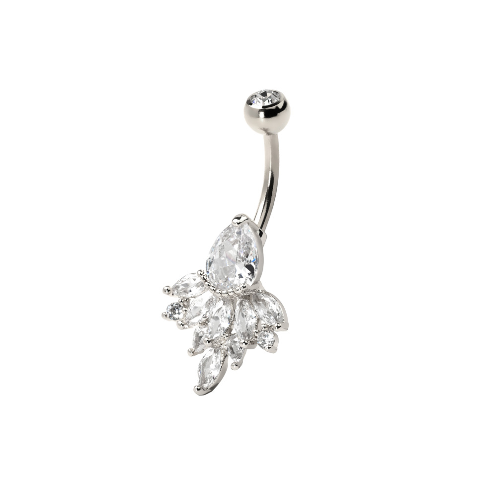 This belly button ring is simply gorgeous. To start with, it has a curved barbell of 3/8" (10 mm) in length and a top ball with a white stone. But if you look closer, you will see that it has several oblong stones fixed in a bigger drop-shaped stone. All of them are diamond faceted, so light reflects on them from different angles. The stones under it are distributed in three rows, and a single oblong stone hangs at the bottom end.