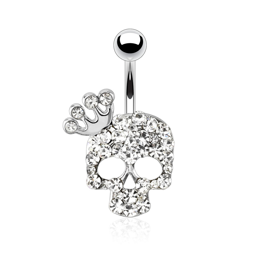 This is a sweet belly button ring with a skull that shines like a handful of diamonds. The clear stones on the skull are white, and they cover all the surface, except the holes for the eyes and nose. The eyes are two big holes, and the nose has the shape of a triangle. This radiant skull has a crown, so it's probably the skull of a sweet princess. The crown is tilted to one side and has four little white clear stones on each of the crown's points.
