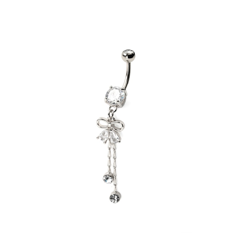 The belly button ring here is one of the longest ones. It measures under 2-3/8" (6 cm) from top to bottom. The bar is 3/8" (10 mm) long; the rest are decorations that consist of stones, chains, and a bow. The loop is made of brass and has two drop-shaped stones. Under it, two dangling chains hang, each with a stone in the end. Besides, one chain is longer than the other.