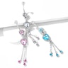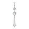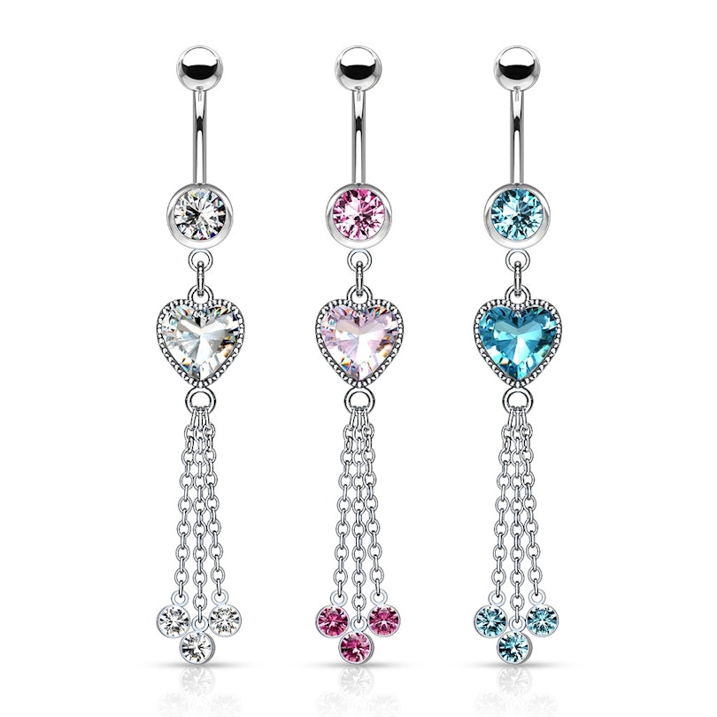 This belly ring features plenty of stones. The curved barbell is made of surgical steel, while the rest has been crafted from brass. The dangle is coated in a color that matches the rest of the belly ring.