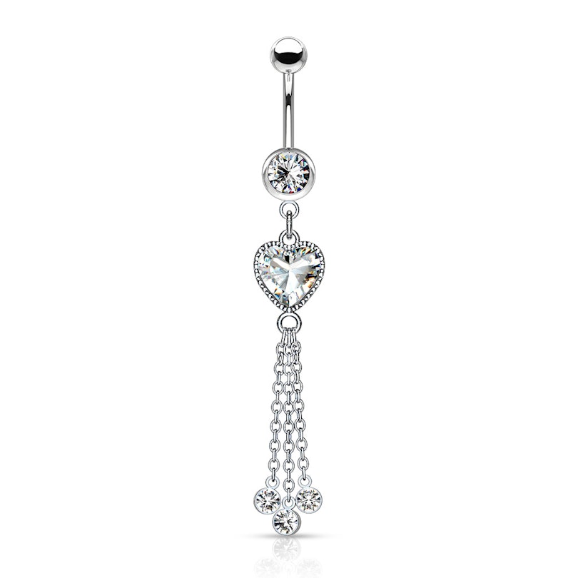 The belly ring is, as mentioned, decorated with several stones. At the bottom of the barbell, there's a large faceted stone, and below it, a heart-shaped stone. From it hang three chains, each ending with a little gem - making a total of plenty of stones!