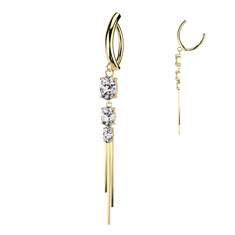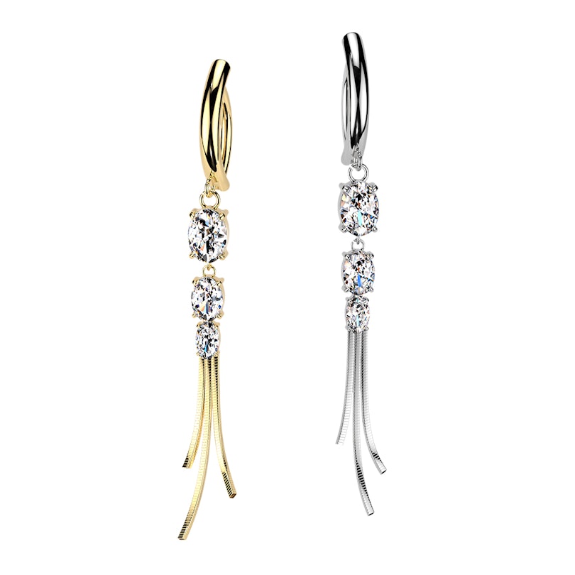 The belly clicker with stones and chains brings extra detail to your navel piercing. Stones sit at the center in a neat prong setting, with fine chain drops hanging below for a more dressed-up look. Available in gold and silver colors, it’s the kind of piece you reach for when you want something beyond a simple bar.