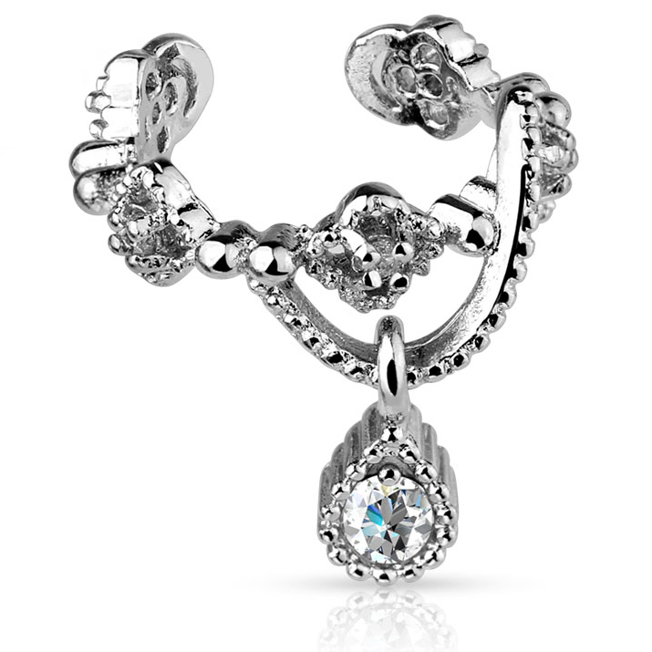 There aren't many ear cuffs with dangles in the market; what you have in front of you is an exceptional piece. The dangle is drop-shaped; it will look as if a teardrop is falling from your ear! There's a round, crystalline-colored stone in the center of the dangle. The stone is carved with the well-known diamond cut, so it can reflect light. This brilliant mirror-effect is great for such a small cuff, worthy of any princess.