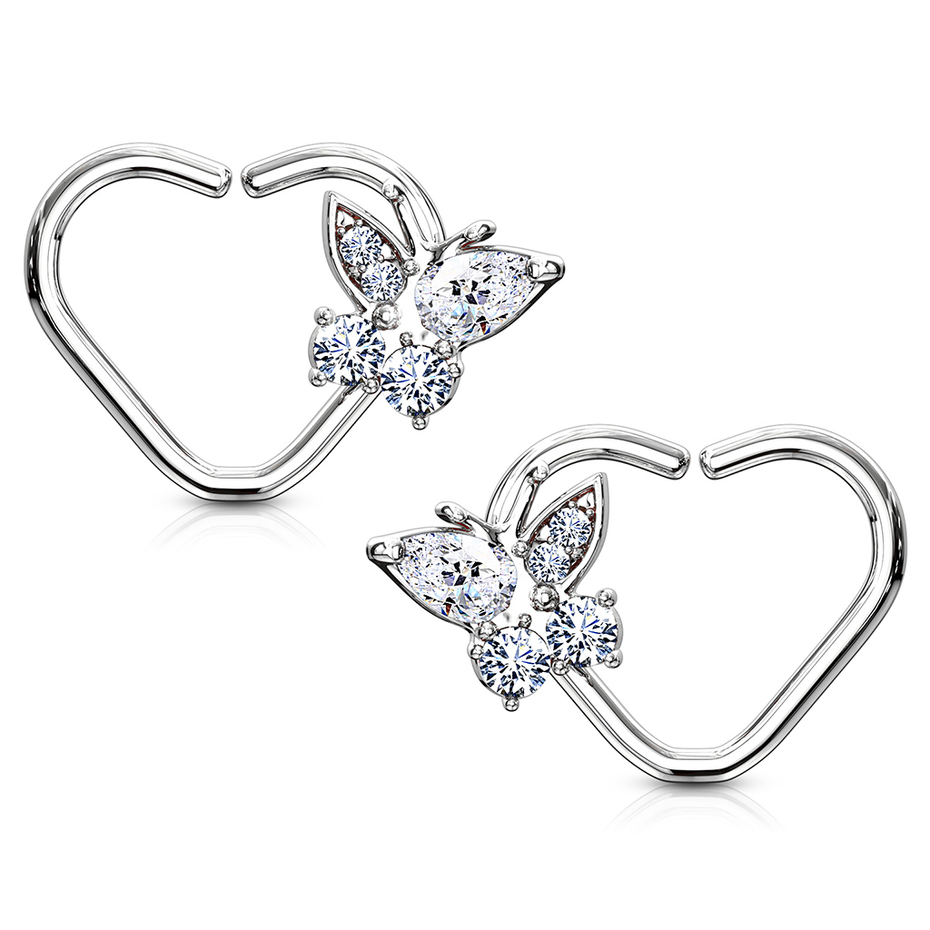 The charm is a studded butterfly on top of the heart that gives an elegant touch to any outfit. It’s been assembled with different carved stones of cubic zirconia. These stones come in transparent color in all the models, regardless of the ring color you select.