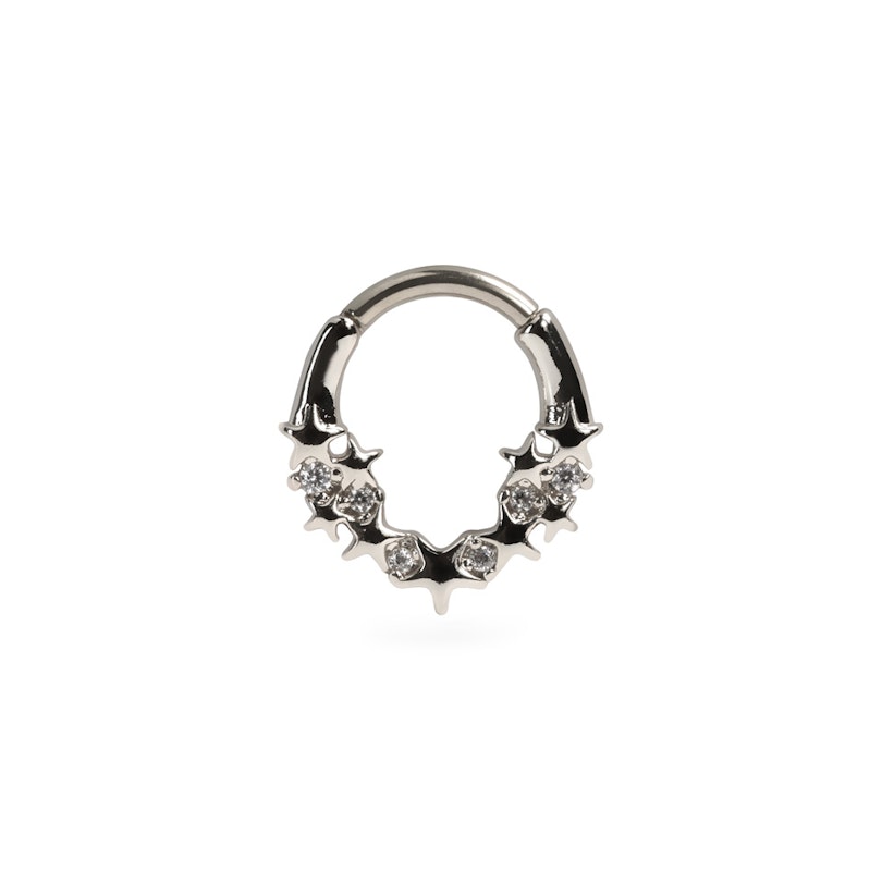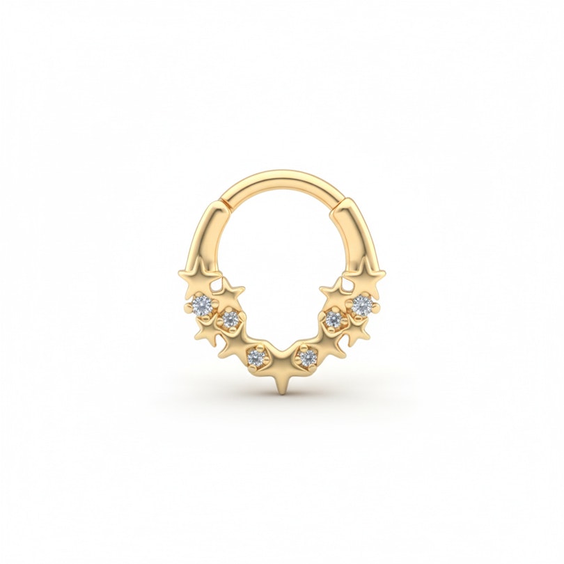 This forward facing ring with stars and moons will make a great addition to your collection. Its hinged opening makes it easy to insert and secure in your piercing.