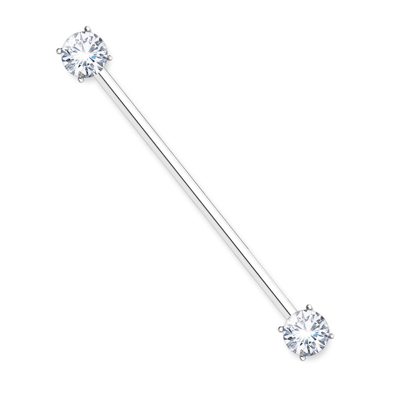 We introduce a never-seen-before straight barbell for an industrial piercing. This double-jeweled barbell is made of stainless steel, featuring beautiful zirconia stones at both ends.