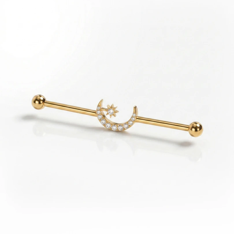 The industrial barbell in titanium with central moon and star brings a clear focal point to your industrial piercing. A crescent moon sits at the center, detailed with small stones, while a tiny star rests just beside it, adding contrast without crowding the design. The layout keeps the barbell clean with the details doing just enough. Available in gold and silver colors.
