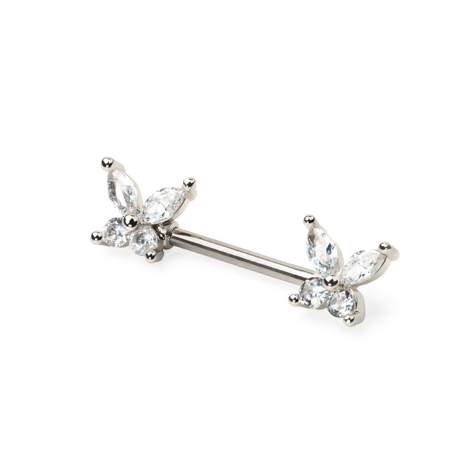 This stunning nipple barbell has two beautiful butterflies on each end adorned with gorgeous glittering stones. The jewelry consists of a 9/16" (14 mm) straight barbell, but the wearable length can vary, given the distance of the butterflies.