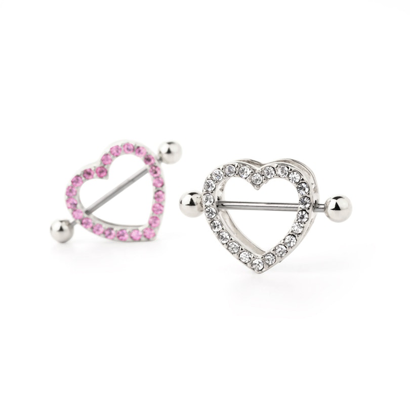 This fantastic nipple shield is perfect for you if you have a good heart ;-) This is an incredibly feminine nipple shield with two big heart-shaped profiles. The upper one is studded with little diamond-shaped stones. The two hearts are set on top of each other, separated with a bit of space. This belongs to the straight bar that goes through your nipple piercing. This shield will make your nipple look super sexy, even more than it is already.