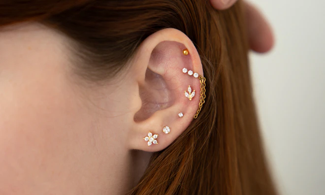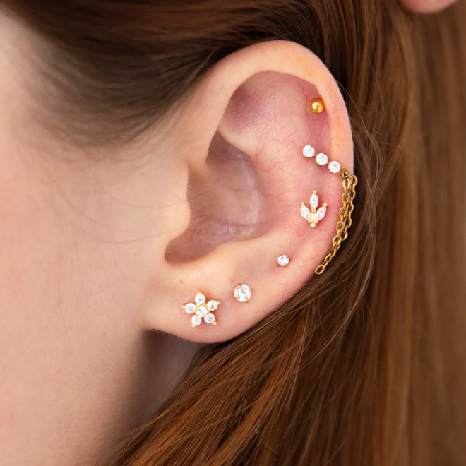 Placement: Tragus, Spiderbite, Snakebite, Nostril, Medusa, Madonna, Lower labret, Lobe, Helix, Conch, Forward helix, Angelbite