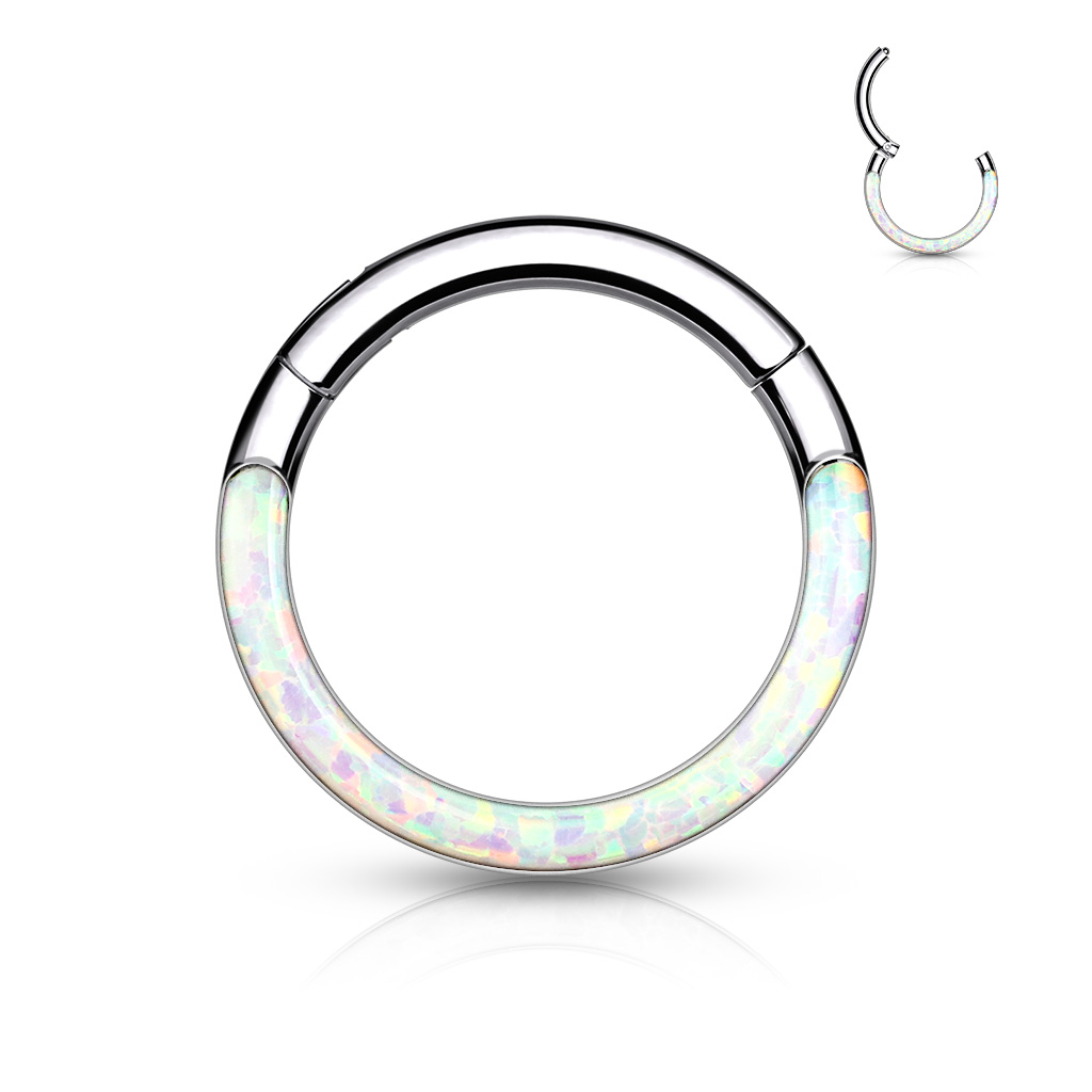 The front of the ring has a front-facing opal that runs from the beginning to the end of the hinge.