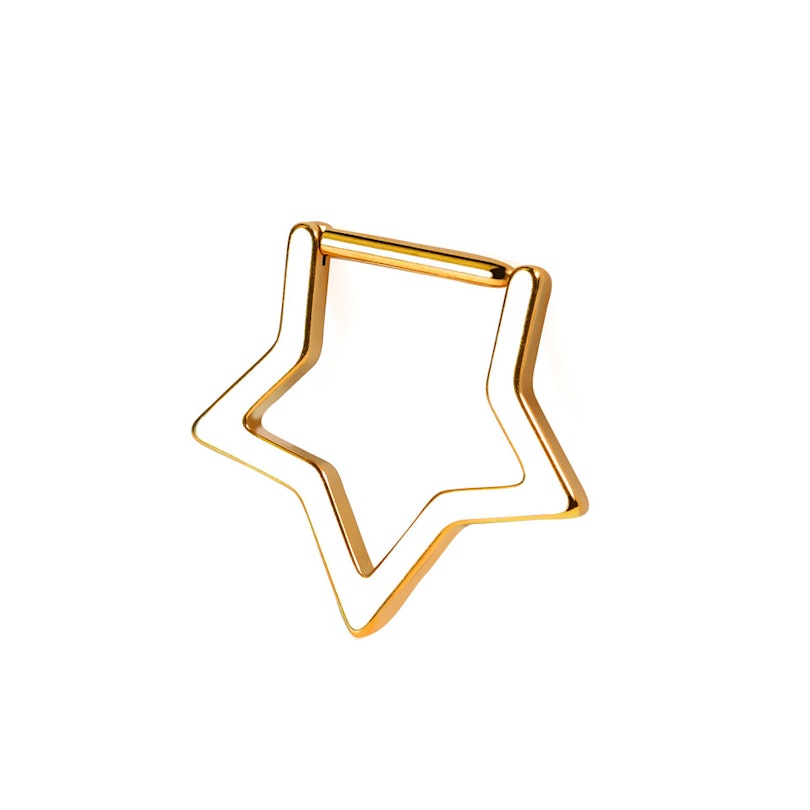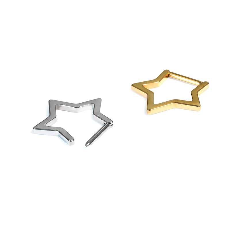 This star-shaped titanium clicker ring is the perfect piece for a variety of piercings. Just for example, it would look great in a septum, helix, lobe, or rook piercing. Crafted from durable titanium, it’s waterproof, gentle on sensitive skin, and made to last. The hinge opening makes it simple to insert into your piercing. This piece is actually hollow, which allows it to have a chunky look while still being super light and comfortable to wear.