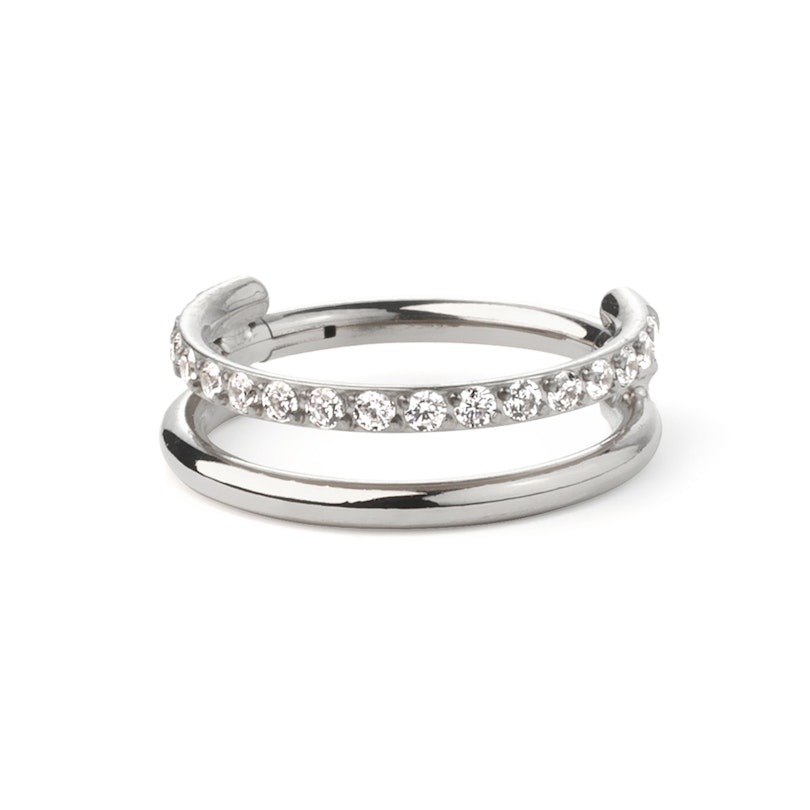 This unusual piece has the appearance of two rings, one with a row of tiny gemstones and one without. The two rings are joined to a single thread that goes into your piercing. Made from titanium, this ring is hypoallergenic and really durable. Available in different diameters, and a choice of gold and silver finishes, this beautiful ring is suitable for a variety of ear piercings and will make a glamorous addition to your ear stack, wherever you choose to wear it.