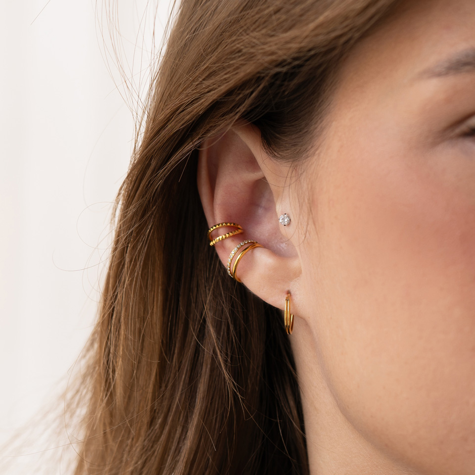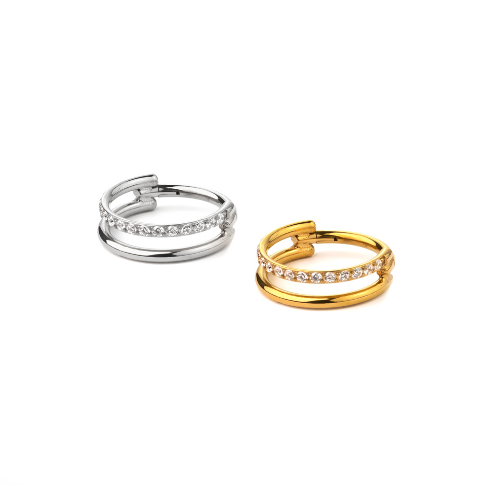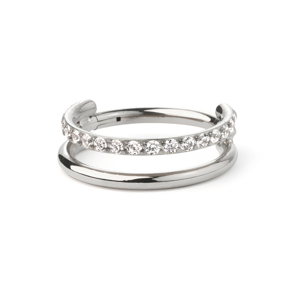 This unusual piece has the appearance of two rings, one with a row of tiny gemstones and one without. The two rings are joined to a single thread that goes into your piercing. Made from titanium, this ring is hypoallergenic and really durable. Available in different diameters, and a choice of gold and silver finishes, this beautiful ring is suitable for a variety of ear piercings and will make a glamorous addition to your ear stack, wherever you choose to wear it.