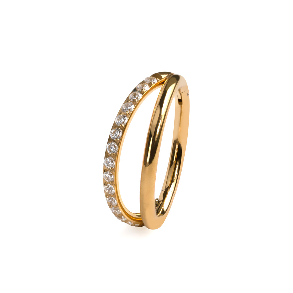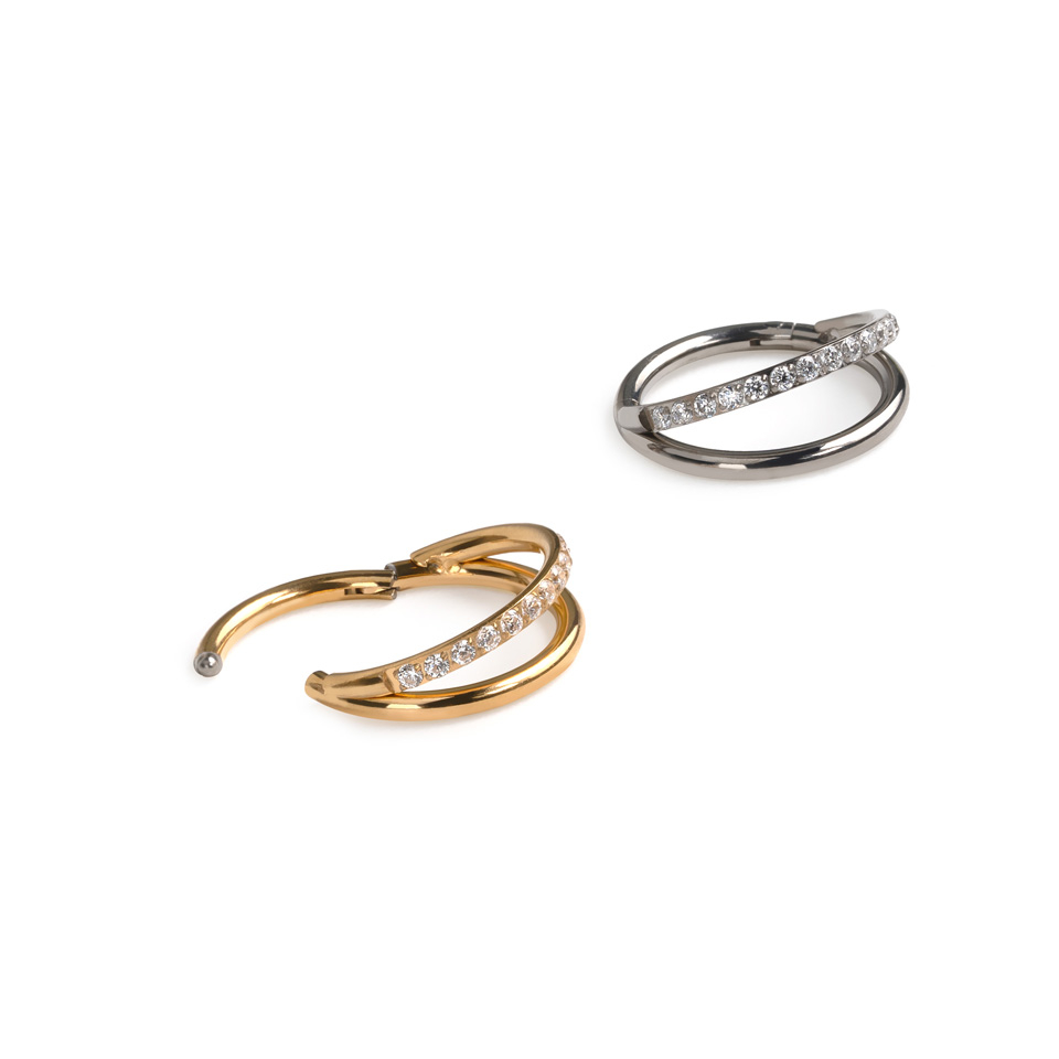 This Bodymod trend's titanium double ring with stones on one band keeps it fresh with a split design; one half smooth and minimal, the other half lined with stones. Two moods, one ring.