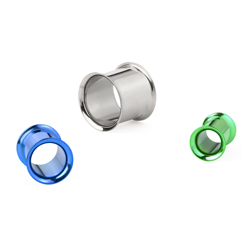 But if you prefer a vibrant tunnel that stands out, look no further. This model is available in a variety of color coatings, such as green, violet, blue, or multi-color. Besides, the beautiful play of colors from different angles will make your tunnel a real head-turner. Under the color coating, it's only solid surgical steel, so you can be sure that complications will not occur.