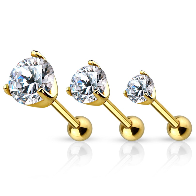 This is your chance to get a luxury set of three ear piercings made of pure gold. These fabulous studs have a thickness or gauge of 16g (1.2 mm), so they fit piercings made with a needle perfectly. The set contains 3 studs with a beautiful clear stone, in three different sizes: 1/16, 1/8", and 5/32" (2 mm, 3 mm, and 4 mm).