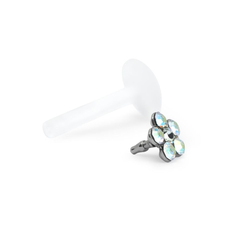 This is a lovely PTFE labret with a top flower bead that is formed by colored gems grouped. You can wear this versatile jewelry in a variety of piercings. It's perfect to create an out-of-the-ordinary look, as most labrets consist of a post with a top ball or spike. But this jeweled one really makes a difference.