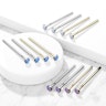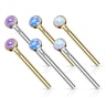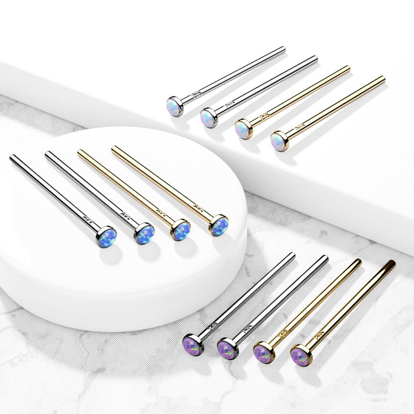 The rod is 3/4" (19 mm) long and is available in two thicknesses. You can also choose the color of the opal stone that sits on top of the rod. The opal is not a real opal, because they are too fragile for jewelry use. This is a synthetic opal that is better suited for jewelry use.