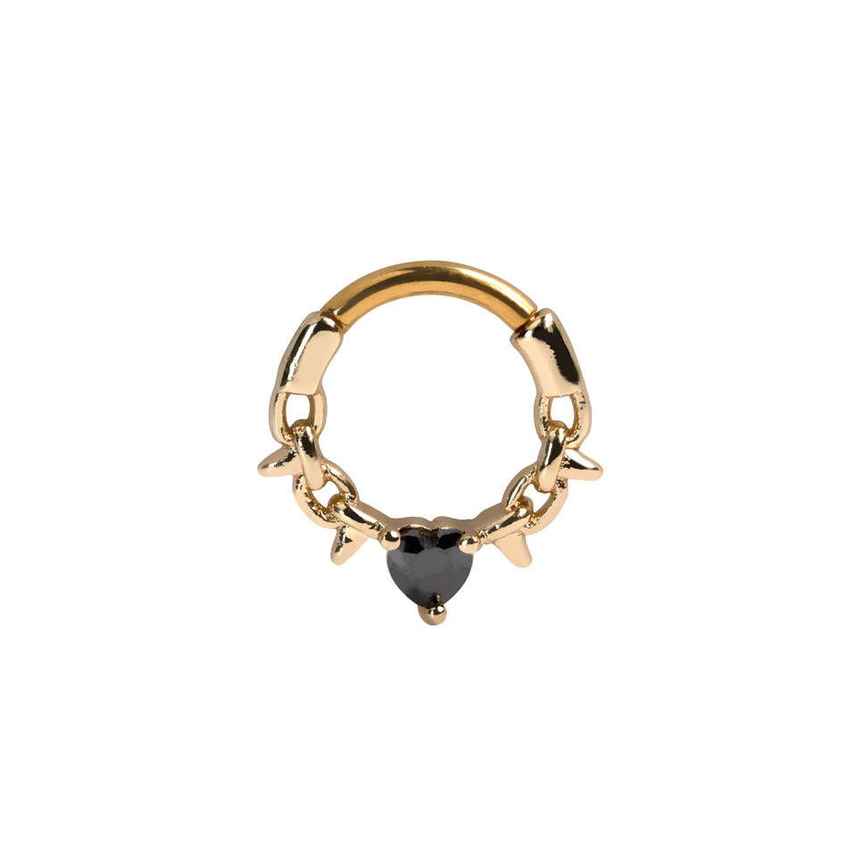 This forward facing ring features a barbed wire design with a black central heart-shaped gem. As it is hinged, it is easy to secure in your piercing.