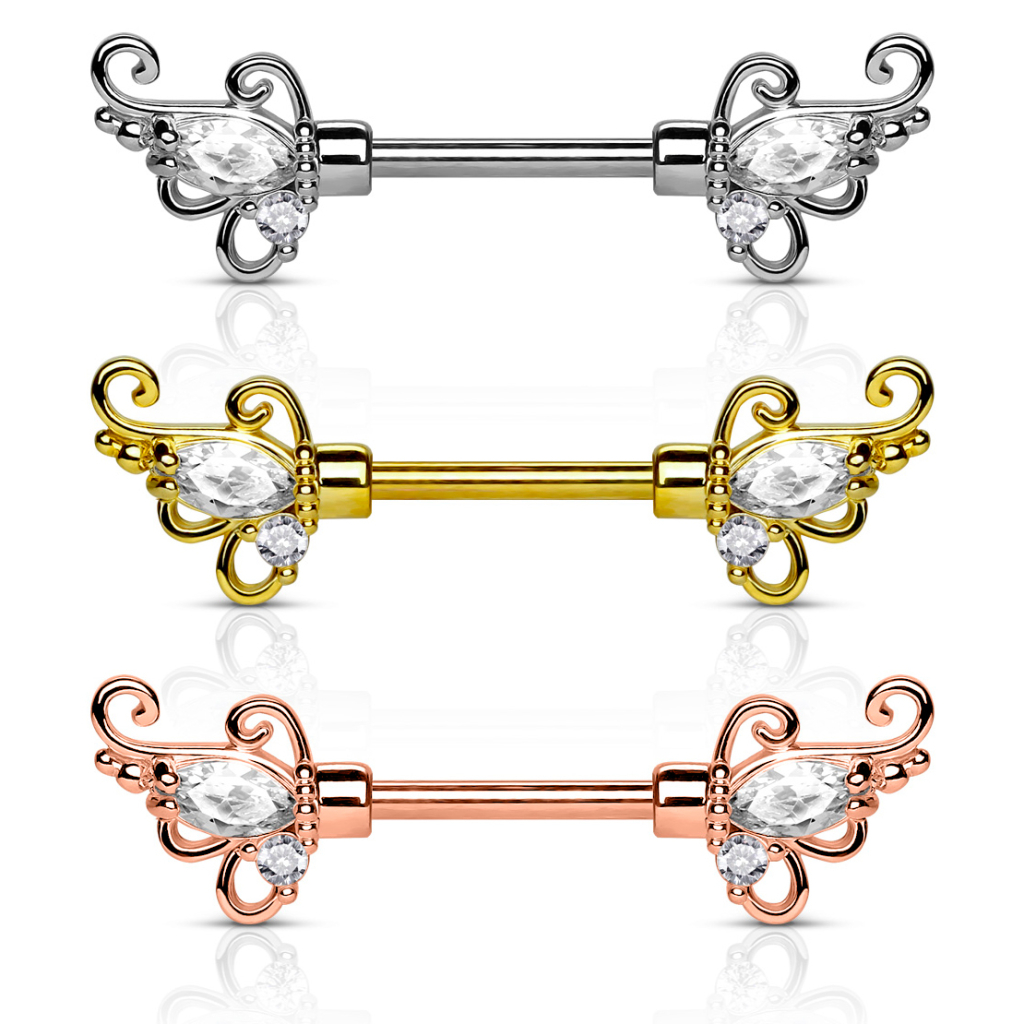 The jewelry you see in the picture is designed for the nipple piercing. The bar has a length of 1/2" (12 mm) and beautiful twisted shapes on each end with little gems. It seems like the details are part of the bar, that has curved ends.