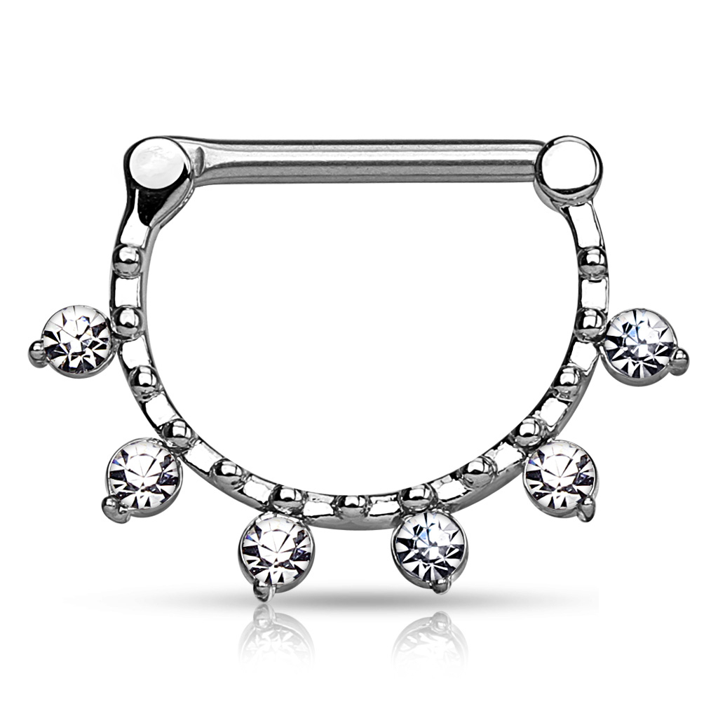 The arch holds pretty little balls, like snowflakes, that complete this sophisticated design. Last but not least, the icing on the cake is the six facet cut clear stones, which make this nipple clicker spectacular.