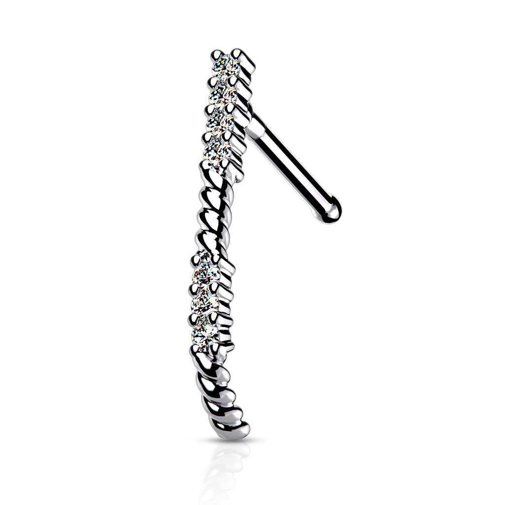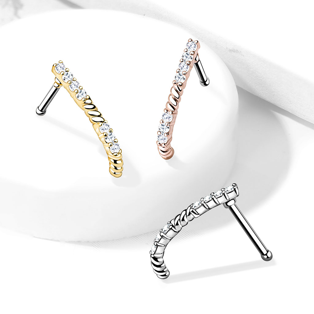 Unique and chic, this item has both, with the stones paving the way the nose to make a statement. The total length of the unique design bone crawler is 13 mm. The nose jewelry is available in 3 different colors: gold, rose gold, and silver. The piece has a standard size for a nostril piercing: a thread thickness of 0.8 mm and a length of 6 mm. A very exciting piece that is a must-have in a nose jewelry collection.