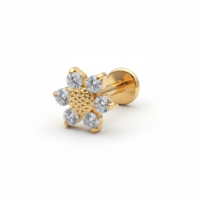 Το μαργαρίτα labret από τιτάνιο είναι μια μικρή υπενθύμιση ότι δεν χρειάζεται να είμαστε σοβαροί κάθε μέρα. Με σχέδιο λουλουδιού από πέτρες σε αγκαλιά και ανάγλυφο κέντρο, διαθέσιμο σε χρυσό και ασημί φινίρισμα, προσφέρει την ιδανική πινελιά παιχνιδιάρικης γοητείας.