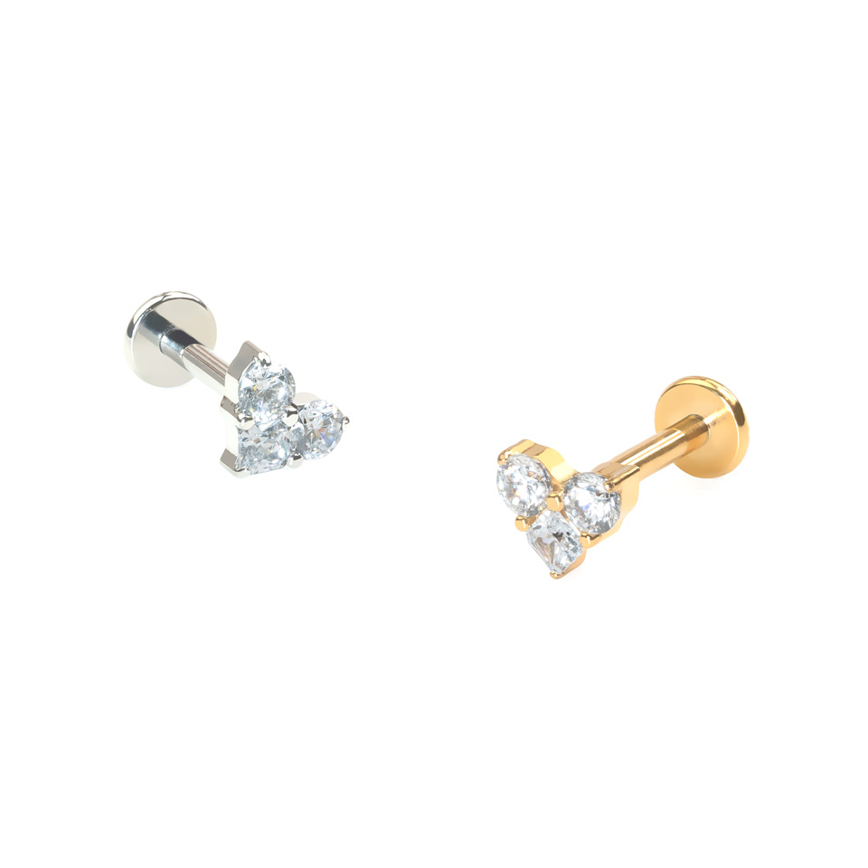 This titanium labret features 3 CZ stones arranged to form a heart shape. The top two stones are round and the bottom is square. It is internally threaded and available in a choice of gold or silver finishes. This cute piece will look great in a range of ear piercings. It measures just 5 mm at its widest point. The flat back ensures comfortable wear.