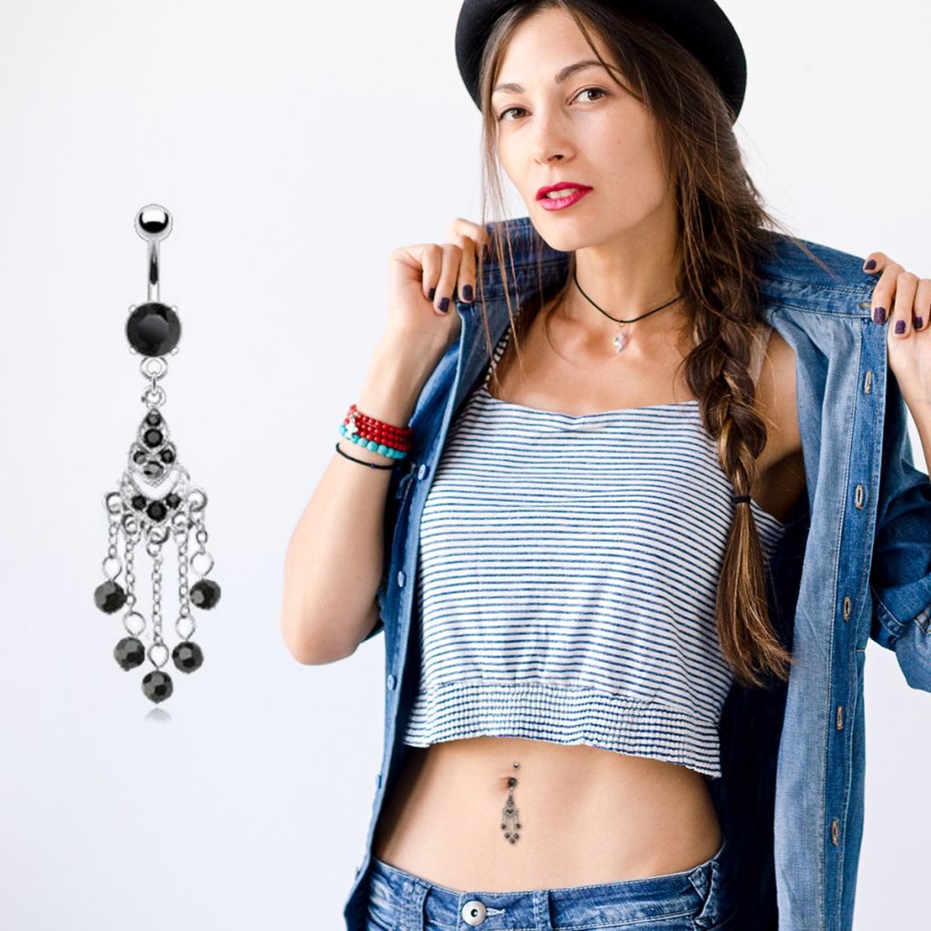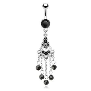 Zaobljena šipkica za pupak s lancima i crnim visećim kuglicama