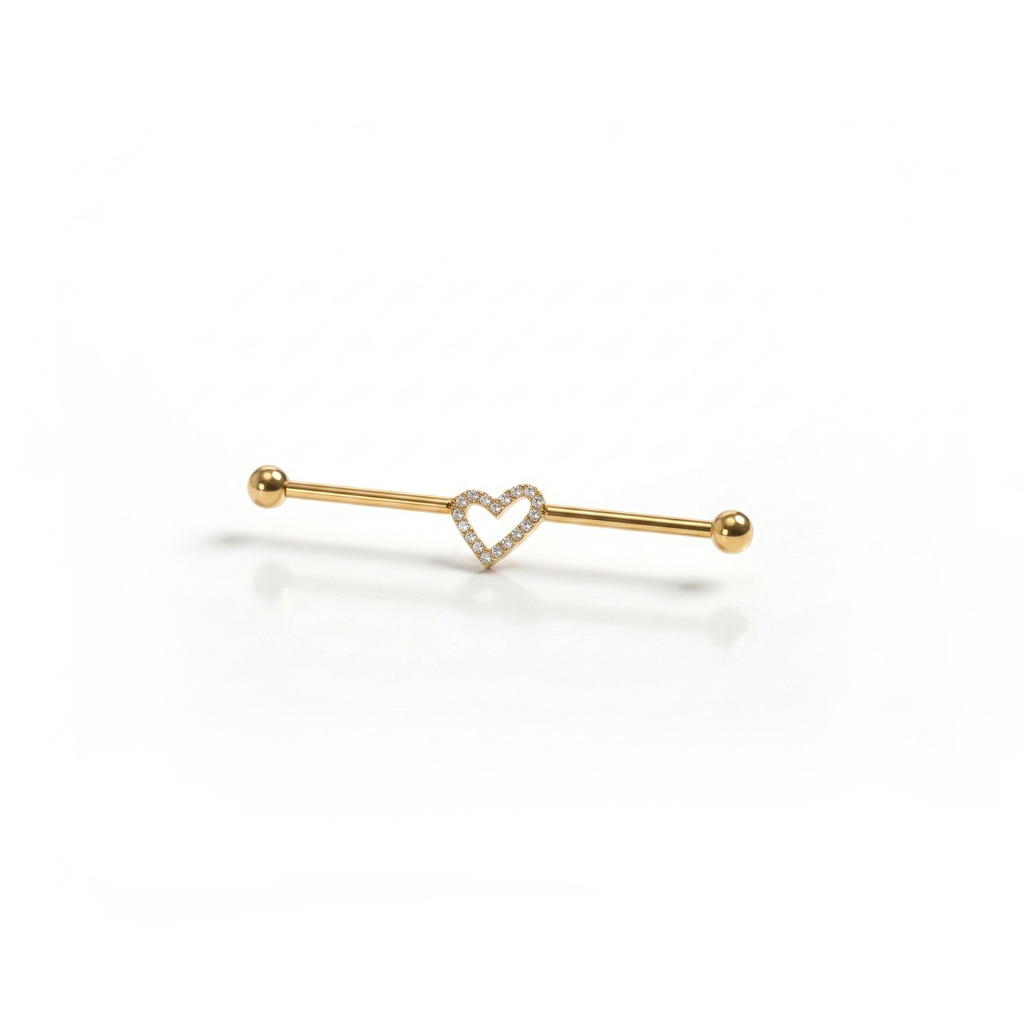 Industrial šipkica od titanija sa srcem u sredini unosi dozu nježnosti u klasičan oblik industrial piercinga. U sredini je srce obrubljeno sitnim kamenčićima u urednom postavu za upečatljiv, ali uravnotežen dojam. Dostupna u zlatnoj i srebrnoj boji.