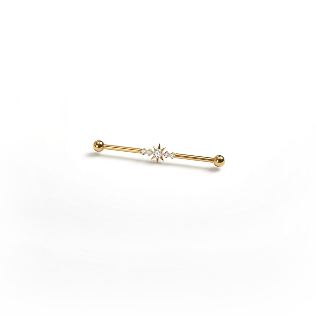 Tražite komad nakita koji će privući pažnju? Ne tražite dalje. Ova industrial šipkica od titanija sa zvijezdom i kamenčićima odmah će privući poglede. U sredini se nalazi sjajni kamenčić u obliku zvijezde, a sa svake strane manji kamenčići za upečatljiv, ali uravnotežen dojam. Dostupna u zlatnoj i srebrnoj boji.