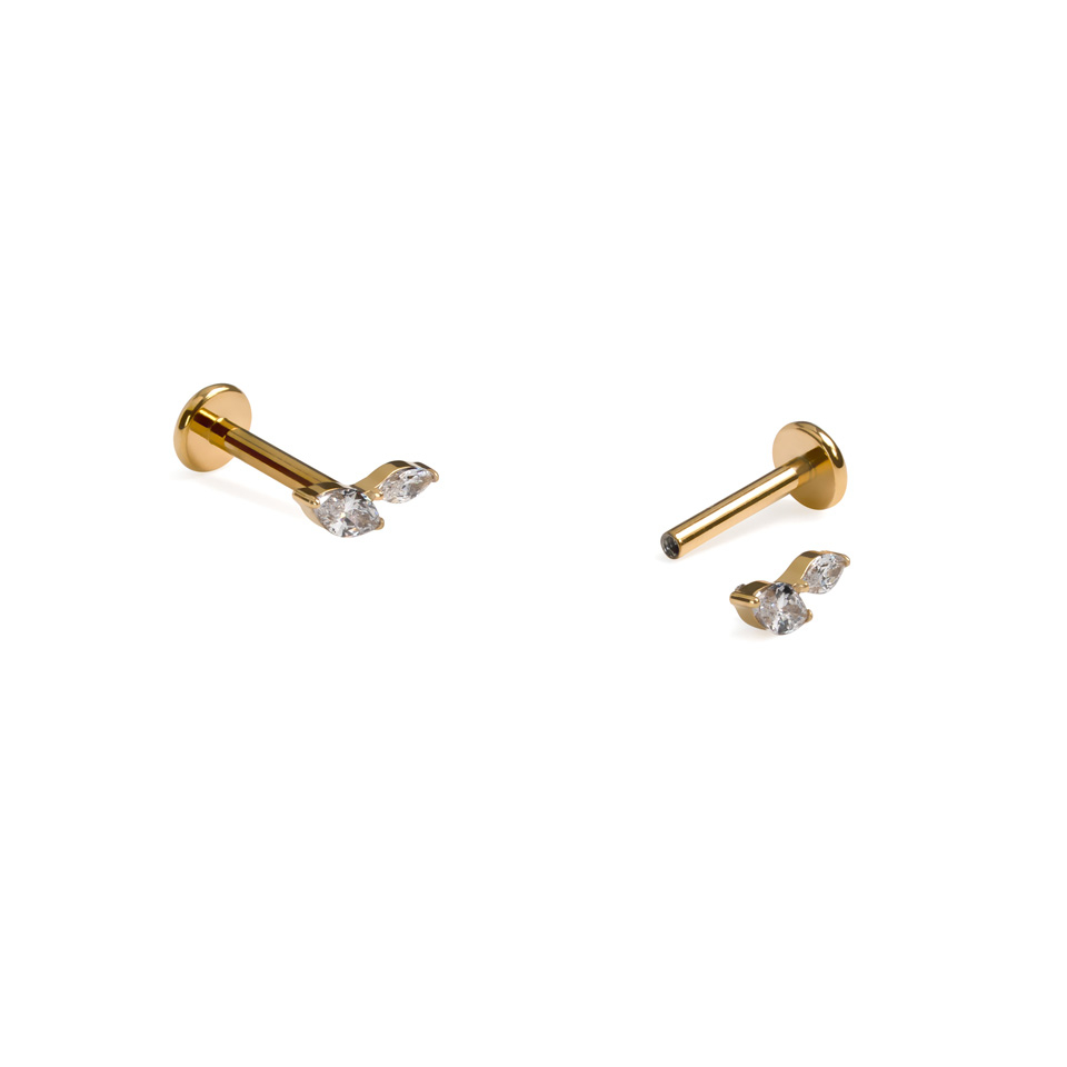 Labret od titanija s dva ovalno brušena kamenčića dokaz je da je manje više. Dva izdužena kamenčića, smještena poput elegantnih listova ili krila, suptilno ističu vaš stil, a da pritom ne kradu pozornost.