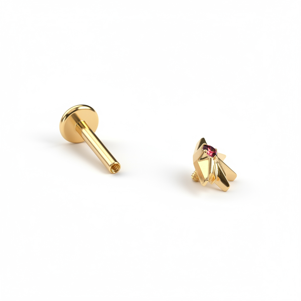 Ovaj labret od titanija u obliku zalaska sunca stvoren je za trenutke koji traju dulje od samog dana. Dizajn s efektom sunčevih zraka i kamenčićem u crvenoj ili prozirnoj boji dostupan je u srebrnoj i zlatnoj varijanti.