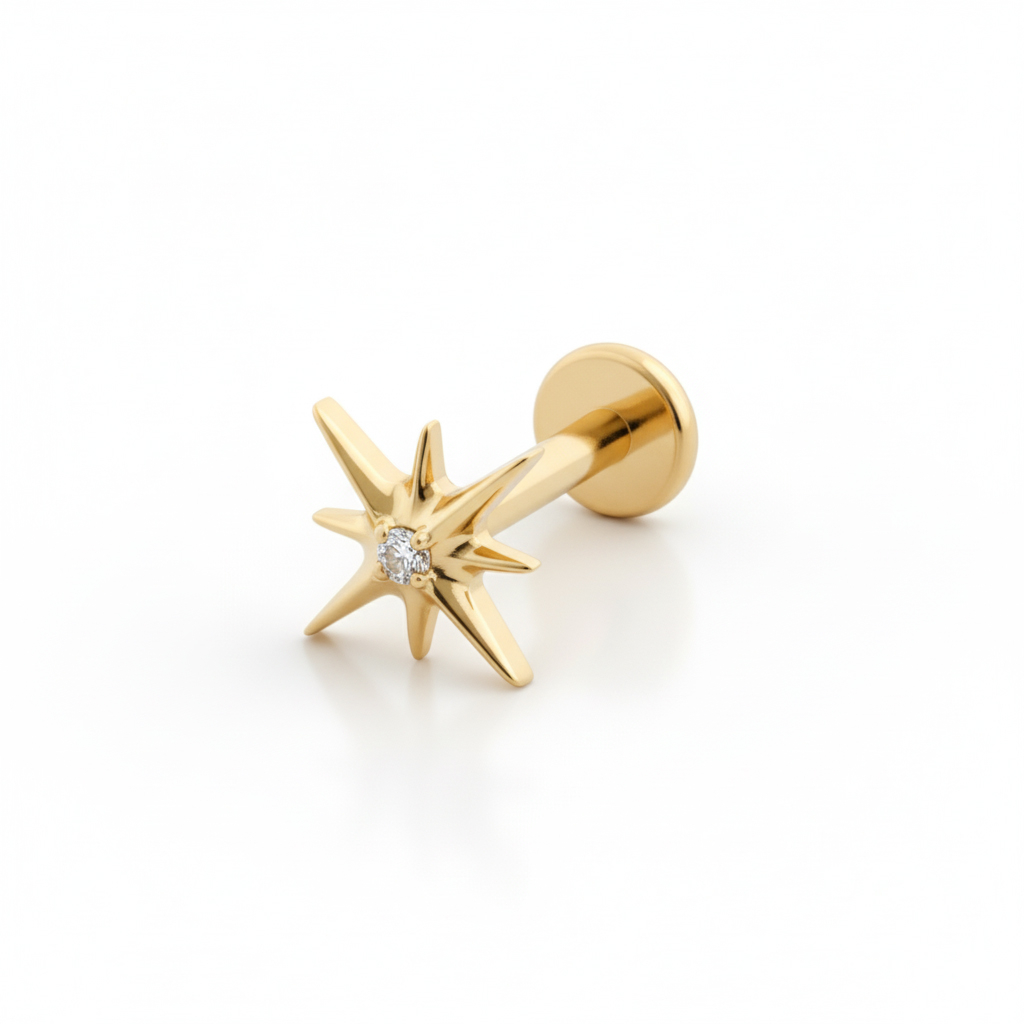 Ovaj labret od titanija u obliku zvijezde s kamenčićem stvoren je za sve ljubitelje nakita koji ne prolazi nezapaženo. Oblik zvijezde naglašava sjajni kamenčić u sredini. Dostupan je u zlatnoj ili srebrnoj boji, ovaj labret je savršen detalj koji se ističe na svakom uhu.